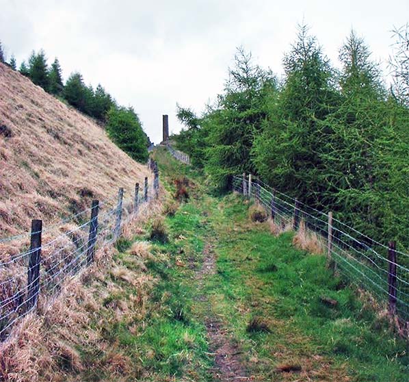 Photo by Ian G Holt ![]() The Facit Incline was built in 1871 to connect Facit Quarry to the to the processing site located in the valley bottom adjacent to the Lancashire and Yorkshire main line. The incline was abandoned in 1946 but the lower finishing works continued to saw and smooth stone for flags un till the mid 1960s. The late 19th century 11.3 metre high stone chimney stands half way along the incline. The chimney was part of a flue system from the engine sheds that provided the power for the machinery that polished, cut and planed stone products. Restoration of the chimney was completed in 2009. It can be reached from the newly created cycleroute NCR 92 from Britannia to Whitworth. This is known as the Valley of Stone Greenway.