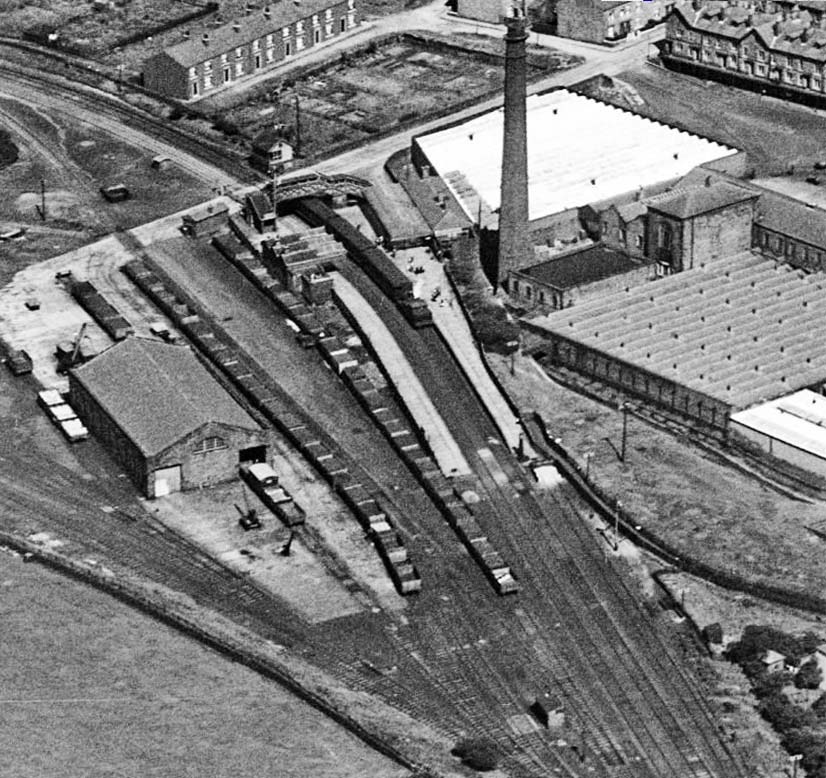 ![]() An aerial view of Facit station in August 1926, in the early years of the LMS; north-east is at the top of the picture. A train is standing at the up platform. The main station building is on this platform and is not aligned with the platform edge. This is because the line terminated here with a single platform aligned to the building. When the railway was extended to Bacup the two tracks swung to the left and the platform was built out to compensate, and the second (down) platform was added. The hipped roof of the main building is complemented by a hipped canopy of similar proportions, and the triple-pitch of the down platform building’s roof is echoed by its ridge-and-furrow canopy. A covered footbridge spans the tracks between the platforms adjacent to the level crossing. The signal cabin is seen just beyond the crossing, on the up side; this would soon be demolished and a house built for the stationmaster on its site. Just left of the footbridge is the weigh office at the entrance to the goods yard, and the goods warehouse is seen left of centre, with one of the sidings passing through it. The yard is busy, with rakes of mineral wagons in its sidings. The train at the up platform is hauled bunker-first by its locomotive: a practice seen on some other LMS or LYR-era photos. Spodden Mill, with its huge hexagonal chimneystack, dominates the photograph. Click here for a larger version.