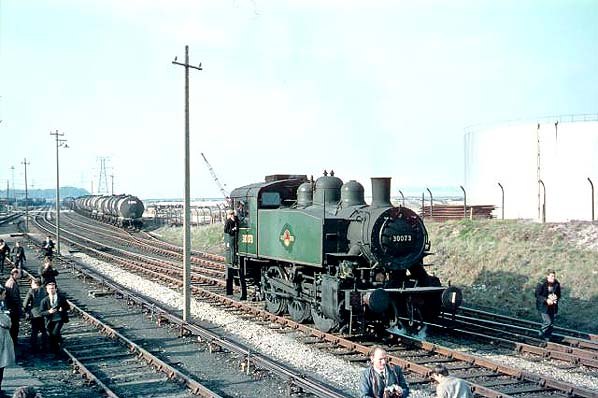 [Source: Nick Catford] Station Gallery 3: 20 March 1966 - 22 March 1975 ![]() Class USA No.30073 at Fawley on 20 March 1966. The occasion was The Solent Railtour', organised by the RCTS. This tour operated to Southampton Ocean Terminal via Salisbury and also visited Gosport. No.30073 operated with No.30064 on the Ocean Terminal - Fawley - Southampton Terminus leg of the tour. The return to Waterloo was from Fareham via Petersfield, Guildford London Road, Oxshott and East Putney. It was a Sunday and the unusual routing was due to the ongoing electrification of the ex-LSWR main line to Bournemouth. No.30073 was in malachite green livery and had received a quick clean of the number and British Railways logo areas. Of the two USA tanks used on the Fawley leg of the tour, No.30073 did not survive into preservation but No.30064 did and today can be seen on the Bluebell Railway.