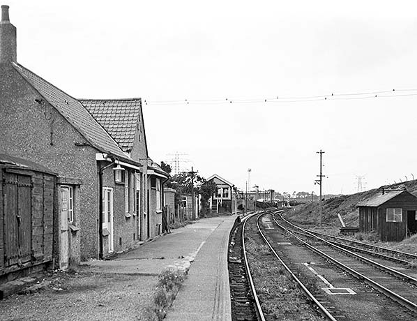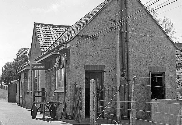 ![]() A close-up of the platform side of Fawley station building in BR days and, seemingly, after closure to passengers. Station buildings on the Fawley branch were quite utilitarian and made few concessions towards attractiveness and the Southern Railways penchant for concrete (albeit rendered here), which actually began with the LSWR, did nothing for aesthetics. On the approach road, left background, stand a number of period cars. Only one can be identified, an Austin A35.