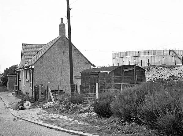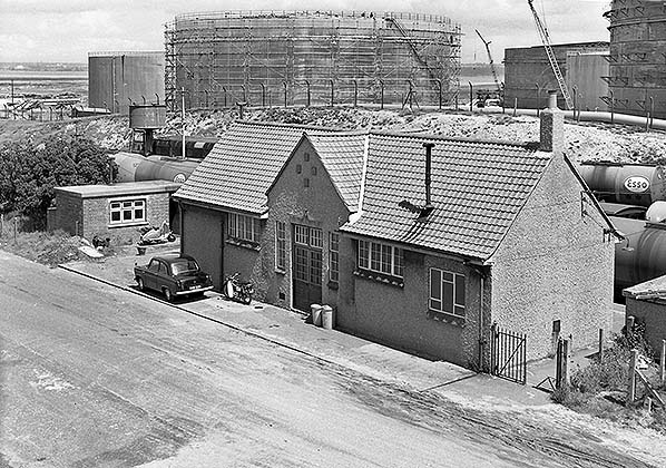 ![]() Less cluttered than on the platform side, here is Fawley station forecourt sometime after closure to passengers. Plenty of tank wagons are visible and beside the water tower stands a BRCW Type 3 diesel locomotive, later Class 33. In front of the station is a Lambretta, a moped of some description and a Ford Anglia 100E. In the far background is Southampton Water while dominating the scene are some of the refinery tanks with either maintenance or construction work in progress. Today Fawley station is within the confines of the refinery, which covers four square kilometres and has a lengthy internal railway network. Recent photographs of Fawley station's surrounds are deceptive; the refinery tracks sprawl south-east, north-east and south-west of the station and there is also a branch to the north-west. With the cessation of rail traffic to the refinery in 2016, only time will tell what will become of the internal rail network.