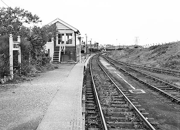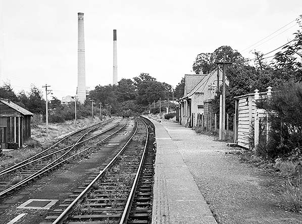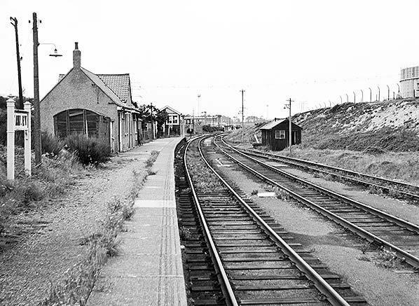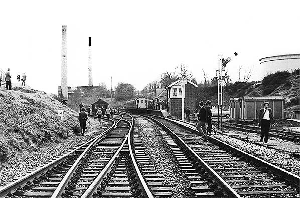 ![]() Looking along Fawley's platform towards Hythe and Totton during the autumn of 1974. The running-in board, left, has lost most of its 'L' and the general air of dereliction belies the fact the line was still very busy with refinery traffic. The one telling point is the well polished rails, which by this time were a mix of flat bottom and bullhead types.