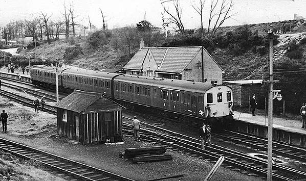 from the wall. Photo by Ian Nolan from his Flickr photostream ![]() On 22 March 1975 Class 3H 'Hampshire' DEMU No.1124 stands at Fawley during The Branch Line Society's 'Hampshire Railtour'. The tour ran to and from Portsmouth & Southsea and by the time Fawley was reached, having first looked-in at the Marchwood Military Railway boundary, it was running early. Booked times at Fawley were arr.13:18 dep.13:25, actual times were arr.12:45, dep.13:20. With the various edifices of Fawley Refinery in the background, it will be noted that the Fawley branch retained signalling nine years into its freight-only period as warranted by density of traffic to Marchwood and Fawley. The signal on the right is the upper quadrant which replaced the low quadrant which had stood at the end of the platform until withdrawal of passenger services. The resiting of this, the Up Starter, signal probably saw an end the Fawley's Advanced Starter but this detail is unconfirmed. The Southern Region DEMU sets had been introduced for replacement of steam services on routes for which installation of the third rail was not considered justified at the time. The 'Hampshire' units, which were by no means confined to that county, came in 2-car (2H) and 3-car (3H) forms with the 2H later being strengthened by the addition of a centre trailer. Unit No.1124 was one of a batch built new in 3-car form. The origin of the additional trailers used for strengthening is rather obscure with opinions varying between new-build, adapted ex-locomotive-hauled stock and purloined former EMU trailers. The various reformations and reclassifications which took place were, however, complex and not especially relevant here. The Southern Region planned the DEMUs with as much standardisation and interchangeability with EMU stock as possible. In the case of the 'Hampshire' units the result was in effect an EPB type EMU with its own on-board power unit. The engine was the English Electric 4SRKT MkII, the same engine as originally fitted to what became the Class 73 electro-diesel. This engine was somewhat underpowered for a loaded 3H DEMU but it nevertheless gave good service and it was the exhaust beat of this 4-cylinder engine which gave rise to the 'Thumper' nickname applied to the Southern DEMU's. Under TOPS the 3H became Class 205 and as unit 205024 No.1124 remained in service until July 2000 and unlike several others did not survive into preservation. The class finally bowed out in 2004 although a preserved narrow bodied 'Hastings' unit of main line configuration can still be seen in action on the national network.