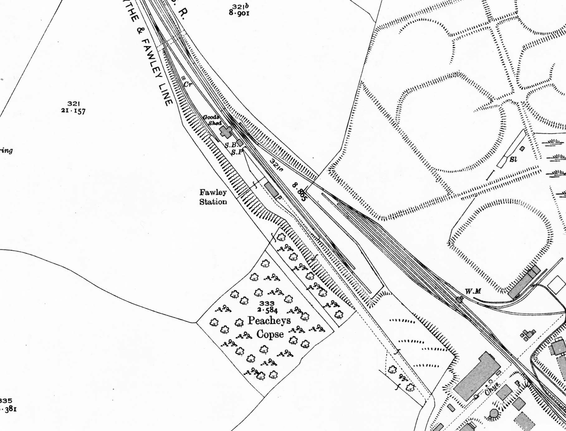 1932 1:2,500 OS map. The station is seen built into a cutting at the end of a short approach road. The platform is on the west (up) side of the line with a two-road goods yard to the north of sthe station on the up side. A goods shed with a canopy over the siding is seen and a signal box (SB) is identified between the shed and the end of the platform. The position of the yard crane (CR) is identified. There is a passing loop opposite tha platorm and a private siding into the Anglo Gulf West Indies Petroleum Corporation Limited (AGWI) refinery to the east.
