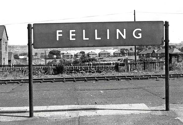 The double-sided running-in nameboard near the western end of Felling second station’s platform. The vitreous enamel sign was in BR North Eastern Region tangerine.