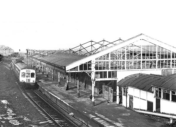 In February 1972 demolition of the platform roofing at Felling second station is at an advanced stage. A Newcastle-bound Class 101 DMU calls at the down platform.
