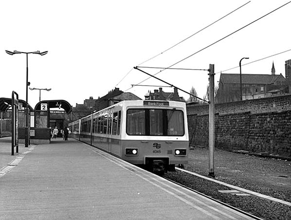 In March 1982 a Metro train for Bank Foot calls at Felling Metro station. This view is looking eastwards.