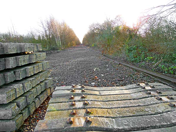 ![]() In December 2012 the tracks have been lifted at Fencehouses – some left by the trackbed, on the right – and concrete sleepers stacked for use elsewhere.