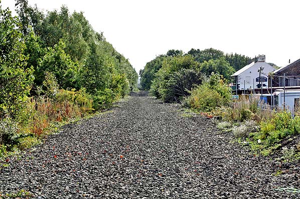 The site of Fencehouses station looking south towards the level crossing in October 2013, a year after the track was lifted. The station inn is seen on the right.