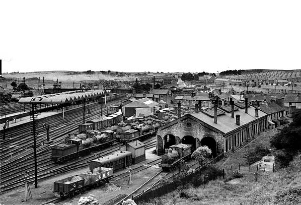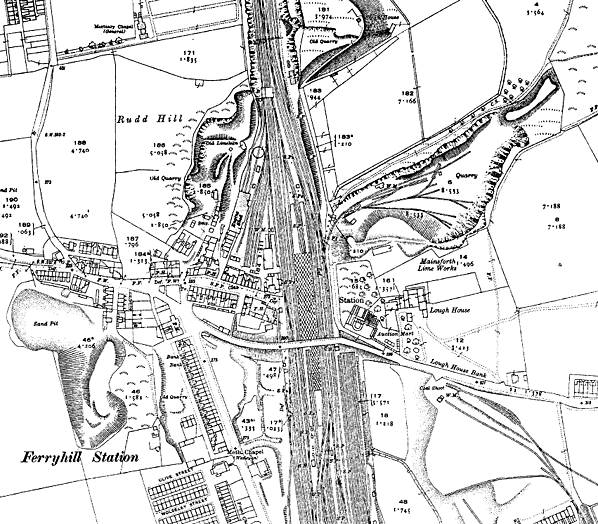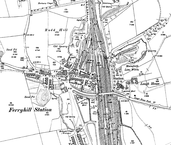 The engine shed and goods yard were immediately north-west of the passenger station, reached by several sidings from the north. The 1904 RCH Hand-book of railway stations indicates that Ferryhill possessed the normal range of goods facilities including a one-ton crane and a large number of associated industrial enterprises that brought traffic to the railway; these included the NER Company gasworks, two limestone quarries with lime works, a sand quarry, a colliery, and engine works and three slag works. A livestock auction mart was also established immediately east of the passenger station.