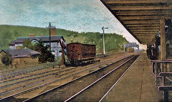 The YNB station building was west of the tracks on the down platform. As with others of this company’s stations G. T. Andrews was the architect. Set at right angles to the tracks it was a handsome ashlar building bearing his hallmarks, but the exterior elevation was stepped forward, lacked a porch and had a small gable rising above an arched first-floor window. A single-storey range abutted the main building and stretched northwards along the platform.