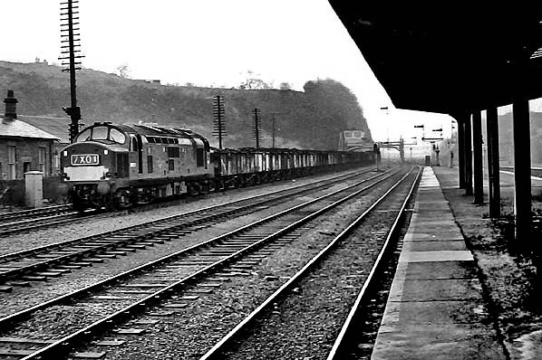 [Source: Alan Young] ![]() D6821 hauls a coal train southwards on the up main line at Ferryhill on 25 February 1967. It is notable for having a ‘diesel brake tender’ to assist the braking of non-fitted freights. The station is placed to serve the lines which diverged to Spennymoor, Hartlepool and Stockton rather than the main line; trains from the south had to leave the down main line, cross the up main, then travel half-a-mile before entering the platform. On leaving the station they then needed to re-cross the up main line. This inconvenient operation was one of the justifications for closing Ferryhill station.