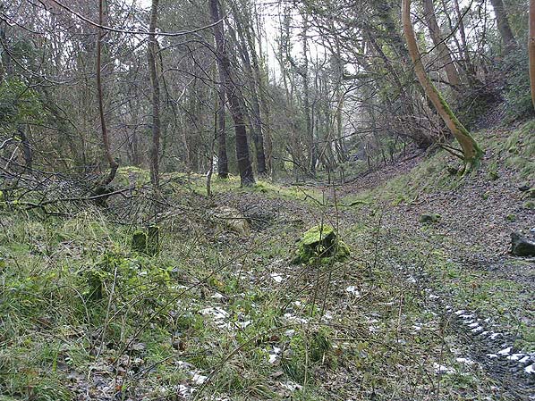 Looking south at the site of Ffrith Station in December 2009. The wooden posts sticking out of the ground towards the left of the picture are the remains of the stations single platform.