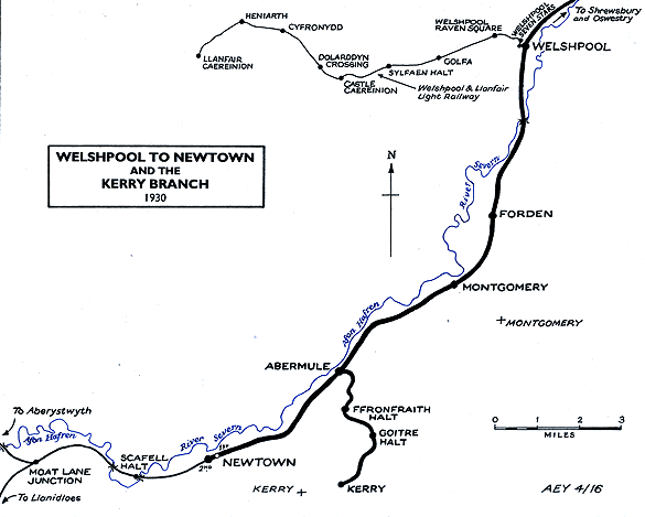 Notes: Ffronfraith Halt (alternatively spelt ‘Fronfraith’, and not always with the ‘Halt’ suffix) was situated on the 3¾-mile Kerry branch which had been opened between Abermule and Kerry by the Oswestry & Newtown Railway on 2 March 1863. The line had passed to the Cambrian Railway on the 25 July 1864 and to the Great Western Railway (GWR) on 1 January 1922. The branch had been opened to serve the sheep trade at Kerry but passenger services had run from the start. By 1922 they had declined to only a couple of trains per day in each direction with no Sunday service.