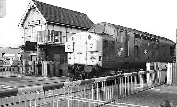 Class 37 diesel 37017 heads west with a freight train over the level crossing past