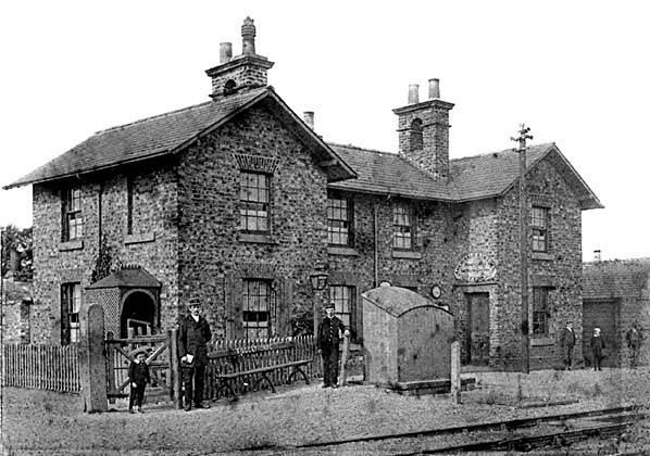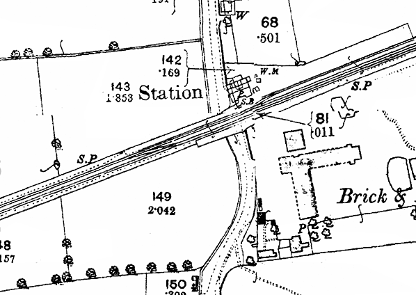 A 13-lever signal box was sited on the east side of the level crossing opposite the station buildings. This replaced an earlier ground frame in front of the station building; this is shown in the 1880s photograph below. The signal box controlled the crossing gates and access to the small goods yard which was on the down side of the line behind the station buildings. This comprised a loop giving access to the yard from both directions, and initially one siding serving a cattle dock, a second siding was later added to serve coal drops. There was a weighbridge and office at the entrance to the yard.