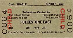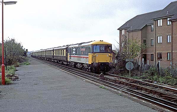 73 211, one of the dedicated passenger sector class 73s, is seen slowing down to take the junction at Folkestone East into Folkestone East Train Roads and passing the disused up platform at Folkestone East station in November 1989. The train is 1Y46 (ThO) 11.15 London Victoria to Folkestone Harbour and the first leg of the VSOE (Venice Simplon Orient Express) luxury heritage train service across Europe. Having crossed the Channel, passengers resume their journey in vintage Wagon-Lits Pullman cars to Venezia Santa Lucia in Itlay. The all-Pullman car train seen here will reverse in the Train Roads at Folkestone East then descend the incline to Folkestone Harbour where passengers will transfer to the waiting 14.30 sailing to Bolougne-sur-Mer in France.