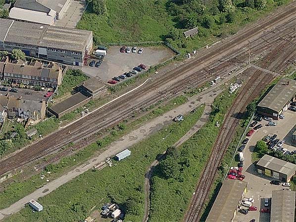 Aerial view of the junction with the Folkestone Harbour line in 2014. Folkestone East signal box is seen on the left. The existing section of the down platform, now used as a staff halt, is to the right of the box at the end of the white line. Click here for a larger version