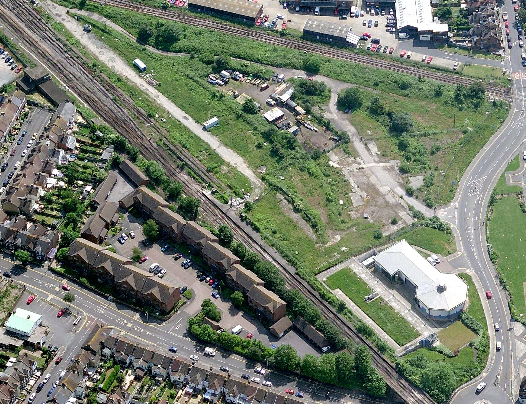 [Source: Nick Catford] ![]() Aerial view showing the site of Folkestone East station and goods yard. The housing to the left of the main line is on the site of the original SER goods yard. The Folkestone Harbour branch is seen at the top. The road on the right is Southern Way which runs through the west side of the goods yard. The rest of the land is awaiting development. The surviving up platform can be clearly seen.