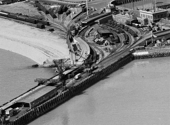 ![]() Folkestone Harbour station and pier in 1933. The tightly curving platforms are seen clearly with the pier platform and the Harbour station up platform separated by the trailing line onto the carriage berthing sidings; these are seen top left together with a goods dock. The Harbour Master's house is seen behind the north end of the up platform (this building is extant). On the down side the original SER station buildings and two-storey Customs House are seen, with the goods yard to the rear. Two travelling cranes are seen on the pier, as is a large covered shed which was built by the Southern Railway. The pier signal box is seen bottom left. Click here for a larger version of this photo.