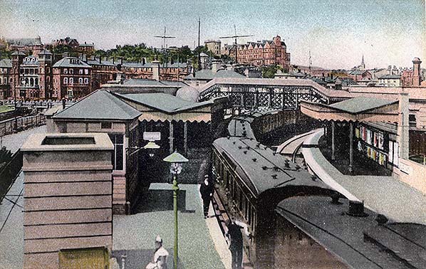 [Source: Nick Catford] ![]() Folkestone Harbour station looking north-west c1904, shortly after the rebuilding of the station had been completed. This project included the removal of the trainshed and the rebuilding of the platforms on a tight curve, as seen here. The signal box standing on the platform was built in 1893 to control access to the carriage berthing sidings. The recently extended Royal Pavilion Hotel is seen in the background.