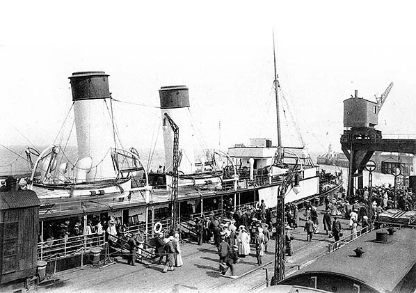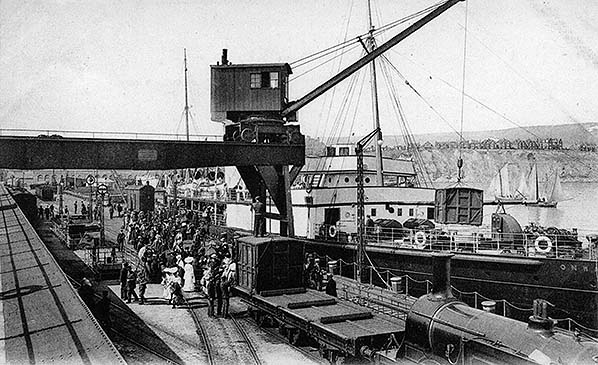 Copyright photo from John Alsop collection ![]() Another view of the SS ‘Onward’ with passengers disembarking after arrival of the vessel from Boulogne; a boat train waits alongside. The ‘Onward’ was named after the motto on the SER's coat of arms. The overhead travelling cranes were provided by this time.