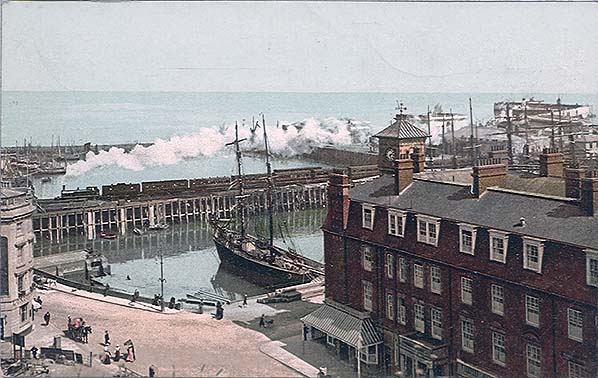 Photo from Jim Lake collection ![]() Looking north along the pier in the first decade of the twentieth century; the pier signal box is seen in the foreground. Sir William Cubitt's Foord viaduct is seen in the background. In the centre the SER's imposing Custom House dominates the harbour.