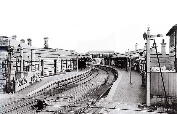 end of the down platform. Photo from John Mann collection ![]() Folkestone Harbour station looking south from the footbridge c1905. The station entrance described in the picture above is seen on the left. A workman is repairing the wagon turnplate on the down line; when the station was first opened this was the only access to the goods yard to the left and the horse and carriage dock to the right. By this date it was also possible to reverse into the yard from the pier. The tightly curved platforms enabled trains to reach the new pier; a check rail is clearly visible on the up line. The starter signal is seen on the left with a replacement under construction behind it.
