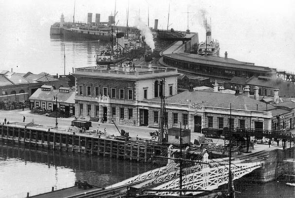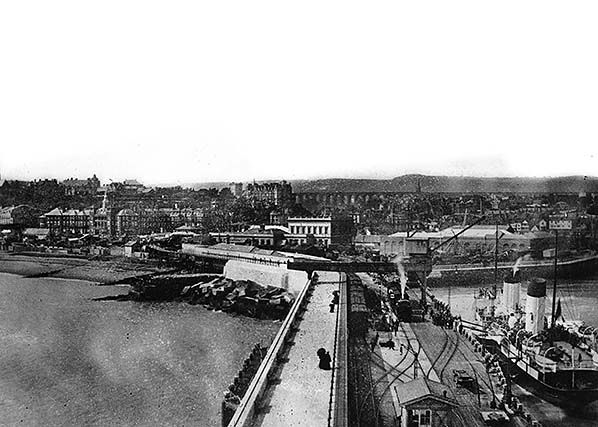 Copyright photo from John Alsop collection ![]() A boat train is seen crossing the viaduct after leaving the Harbour station c1905. The brick viaduct was flanked by wooden piers that held additional tracks.