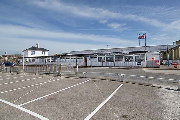 The Sealink booking office and buffet still stands in a dilapidated state in May 2015. The main part of the building is used as an office for the Folkestone Harbour Company and the Harbour Station Café to the left of the flag. The building did extend further south but that end has been demolished. The harbour master's house is seen on the left. Photo
