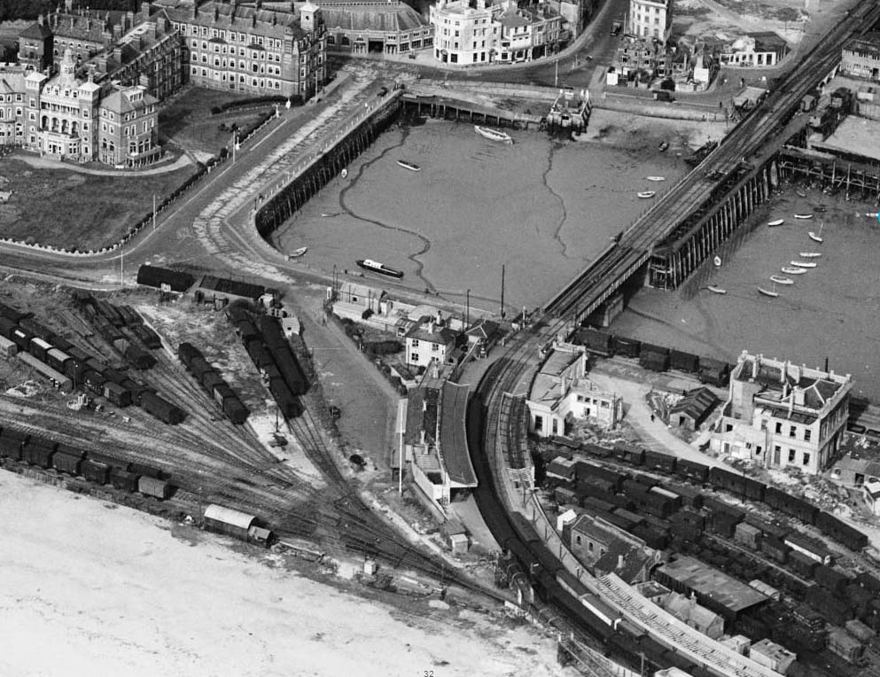 Another aerial view of the Harbour station and goods yard in 1946. The viaduct and swing bridge are seen to the north of the station separating the inner (left) and outer harbour. The brick viaduct originally had wooden piers on both sides to support additional rails; those on the west side have been demolished. The SE&CR signal box is seen at the north end of the up platform behind the Harbour Master's house.