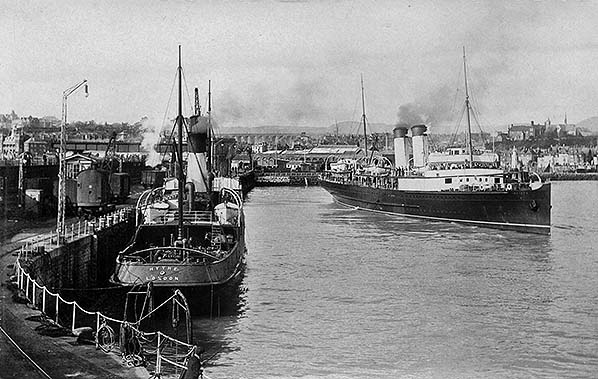 [Source: Nick Catford] The SS ‘Hythe’ is seen at the landing stage at Folkestone Harbour c1906 while the SS ‘Onward’ departs for Boulogne. The SS ‘Hythe’ was built for the South Eastern & Chatham Railway by William Denny & Brothers of Dumbarton in 1905. After a short career as a cross-channel ferry the vessel was requisitioned by the Royal Navy in 1914 and became HMS ‘Hythe’ and was converted to a minesweeper at Scapa Flow. While in later use as a troop carrier she was run down by HMS ‘Sarnia’ off Cape Helles in the Dardanelles on 28 October 1915 and sank with the loss of 155 lives.