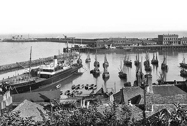 [Source: Nick Catford] The SS ‘Hythe’ is seen in the outer harbour at Folkestone in 1908. The two-storey SER Custom House is seen at the rear of the South Pier on the far side of the harbour; to its left is the large goods shed.
