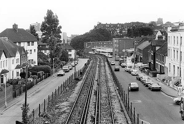 Folkestone Harbour branch line looking south-west towards the harbour from Wear Bay Road bridge in August 1987