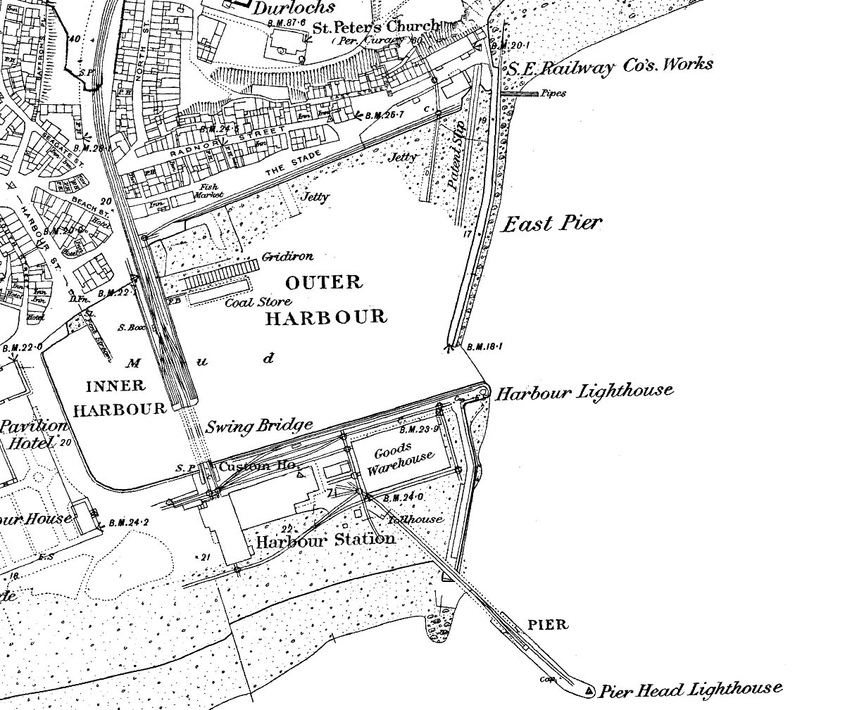 1873 1:2,500 OS map shows the layout of the harbour and station. The harbour is formed from three piers: the West Pier, which is in front of the Pavilion Hotel; the South Pier in front of the station; and the East Pier. The fourth south-east-facing pier is a later addition; this was built in 1861 to counter problems caused when larger steamers were berthing at low tide inside the harbour. By this time it was rail-served but could not yet be reached by passenger trains as the only rail access required the use of wagon turntables. The large goods warehouse, encircled by sidings, is to the east of the station. The viaduct and swing bridge separate the inner and outer harbour. There are two tracks running across the viaduct flanked by a further two tracks supported on timber piers. Before the Harbour station opened in 1850 the viaduct was the terminus of the line and also acted as a coal jetty; a coal store is seen to the east. There is a signal box on the west side of the viaduct. The South Eastern Railway had a works at the north end of the East Pier reached by a siding running alongside The Stade.