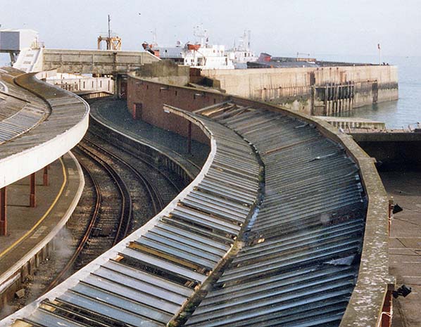 Folkestone Harbour station;the V-shaped canopy looking south-west towards the pier from the footbridge in March 1999.