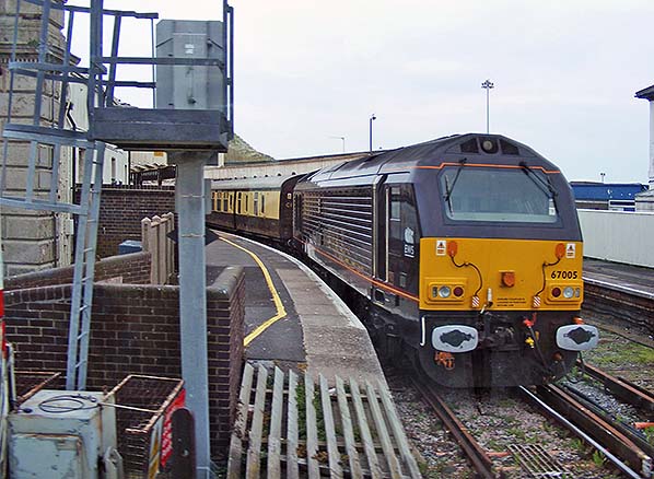 [Source: Nick Catford] A Class 67 diesel-electric loco at the front of the Venice Simplon-Orient-Express (VSOE) in the down platform at Folkestone Harbour station on 14 June 2007. By this time the up line had been partially lifted. Photo by Chris Fletcher