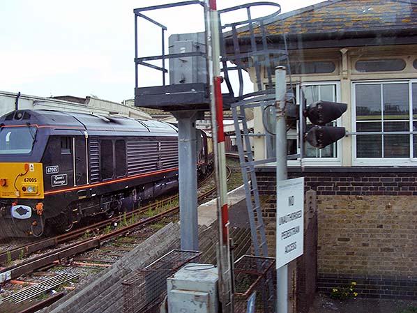 A Class 67 diesel-electric loco at the front of the Venice Simplon-Orient-Express (VSOE) in the down platform at Folkestone Harbour station on 14 June 2007.