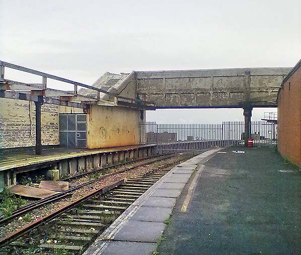 [Source: Nick Catford] Folkestone Harbour station looking south-east towards the pier from the down platform in 2012. At this time the pier promenade was open to the public with access along the platform and up the stairs. It closed in 2014. Photo by Mark Madeleine