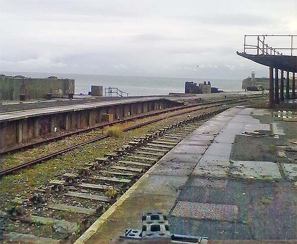 Folkestone Harbour station looking south-east towards the pier from the down platform in 2012.