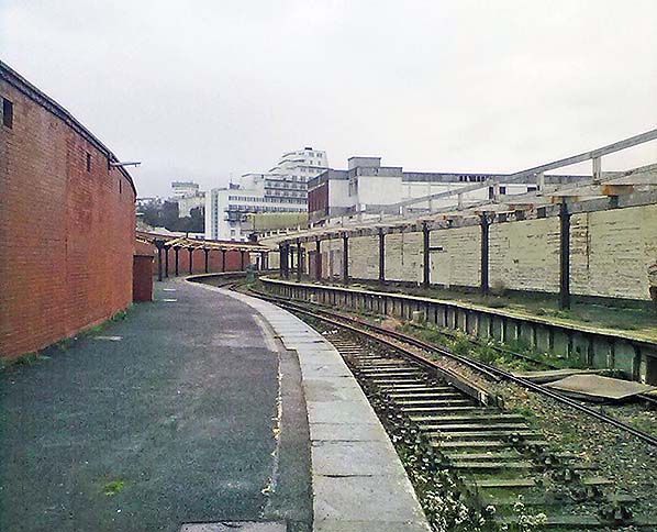 Folkestone Harbour station looking north-west along the up platform in 2012. The Grand Burstin Hotel is seen in the background.