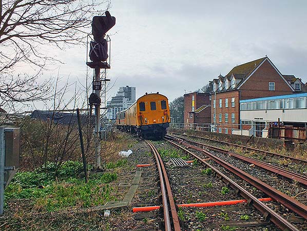 [Source: Nick Catford] The last inspection train along the Folkestone branch ran on 24 February 2012. It had been planned to run into the station but was forced to stop just short on the viaduct because of the poor condition of the pointwork. The inspection train is seen at the north end of the viaduct. Photo by Paul Lemon