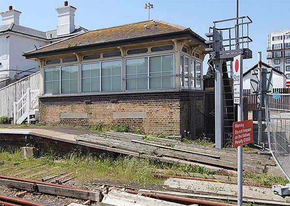 Folkestone Harbour signal box at the north end of the up platform in May 2014. The box still contains all of its original equipment