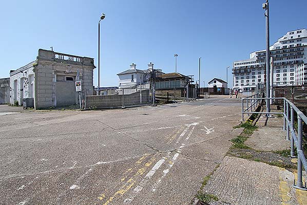 The level crossing at the north end of Folkestone Harbour station in May 2014. The photographer is standing on the South Pier. The building on the left is part of the original SER station building and was the entrance, leading to the booking office. Photo