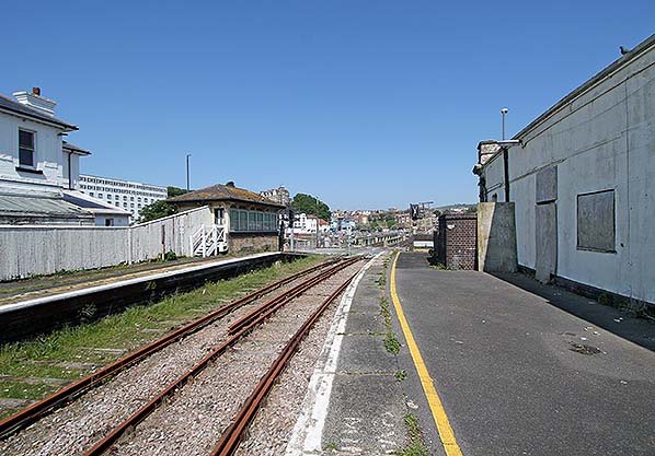 Looking south along the down platform at Folkerston Harbour station in May 2014. The structure on the right is part of the original SER station building