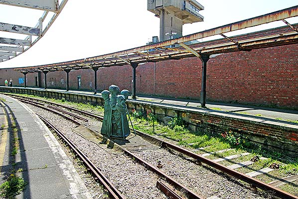 Folkestone Harbour station in May 2014. Varga Weisz’s five-headed sculpture ‘Rug People' is in the foreground. The history of the station, especially bringing WW1 soldiers to the harbour to embark on ships for France, as well as the station being the terminus for the Orient Express until 2008, provided the major inspiration for Varga Weisz’s work. The sculpture appeared during the 2011 Folkestone Triennial when artists were invited to use the town as their ‘canvas’, utilising public spaces to create striking new pieces that reflected issues affecting both the town and the wider world. In the background to the east of the station the coastguard station is seen; this was demolished in 2014.