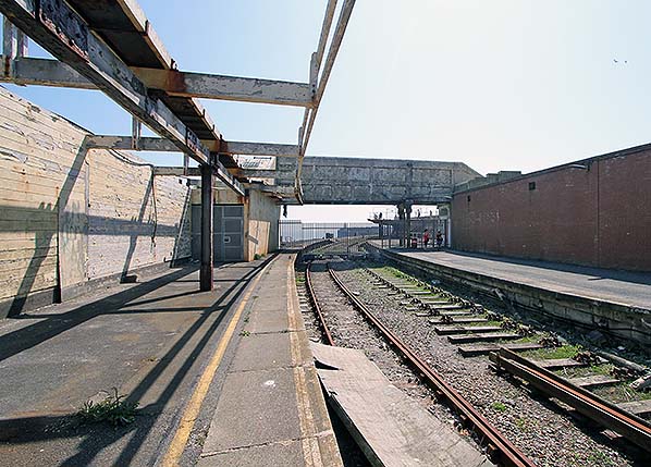 Folkestone Harbour station looking south-east from platform 1 towards the pier in May 2014. The footbridge was built in 1938 when the down platform was extended. The previous lattice footbridge was demolished in 1920.