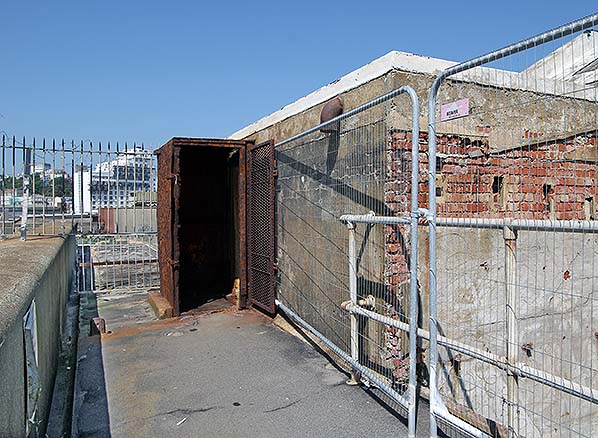 Folkestone pier promenade in May 2014. The door leads to the up platform at a lower level. The footbridge is completely blocked off