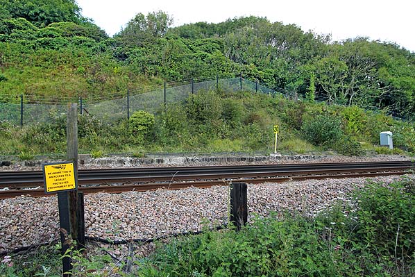 ![]() The up platform at Warren Halt has been removed but the earlier down platform is extant and is seen here in September 2014. The line has reballasted so the platform appears lower