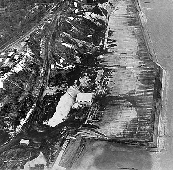 ![]() An aerial view of the Warren work site in 1953. The 1948 work is the rectangular area nearest the camera, the tapered part being added in 1951-52. The outer walls comprise concrete blocks, cast on site and joined with old rails. Rock from Meldon Quarry was brought from Devon and hand packed as a base layer. Onto this, a weight of some 43,000 tons of chalk was placed. Warren Halt was retained for use by staff, and can just be made out top left.